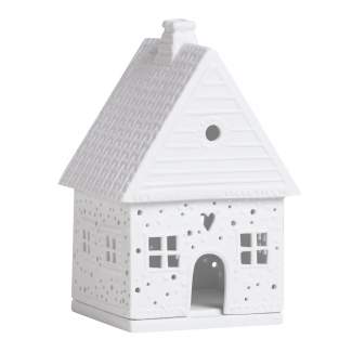 Lichthäuschen aus unglasiertem Porzellan mit Kerzenteller, Maße: 9 x 8,5 x 14 cm.